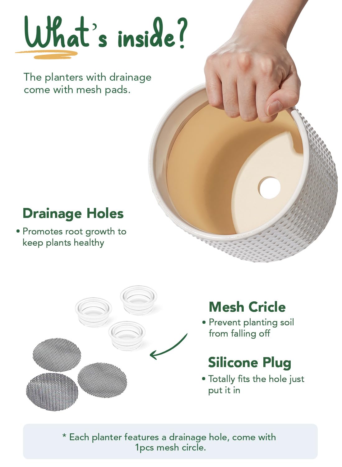 - Drainage Hole & Accessories - Each ceramic pots for plants features carefully designed drainage hole to maintain optimal soil moisture. The inclusion of silicone plugs and mesh pads provides added convenience, giving you flexibility in how you care for your plants.