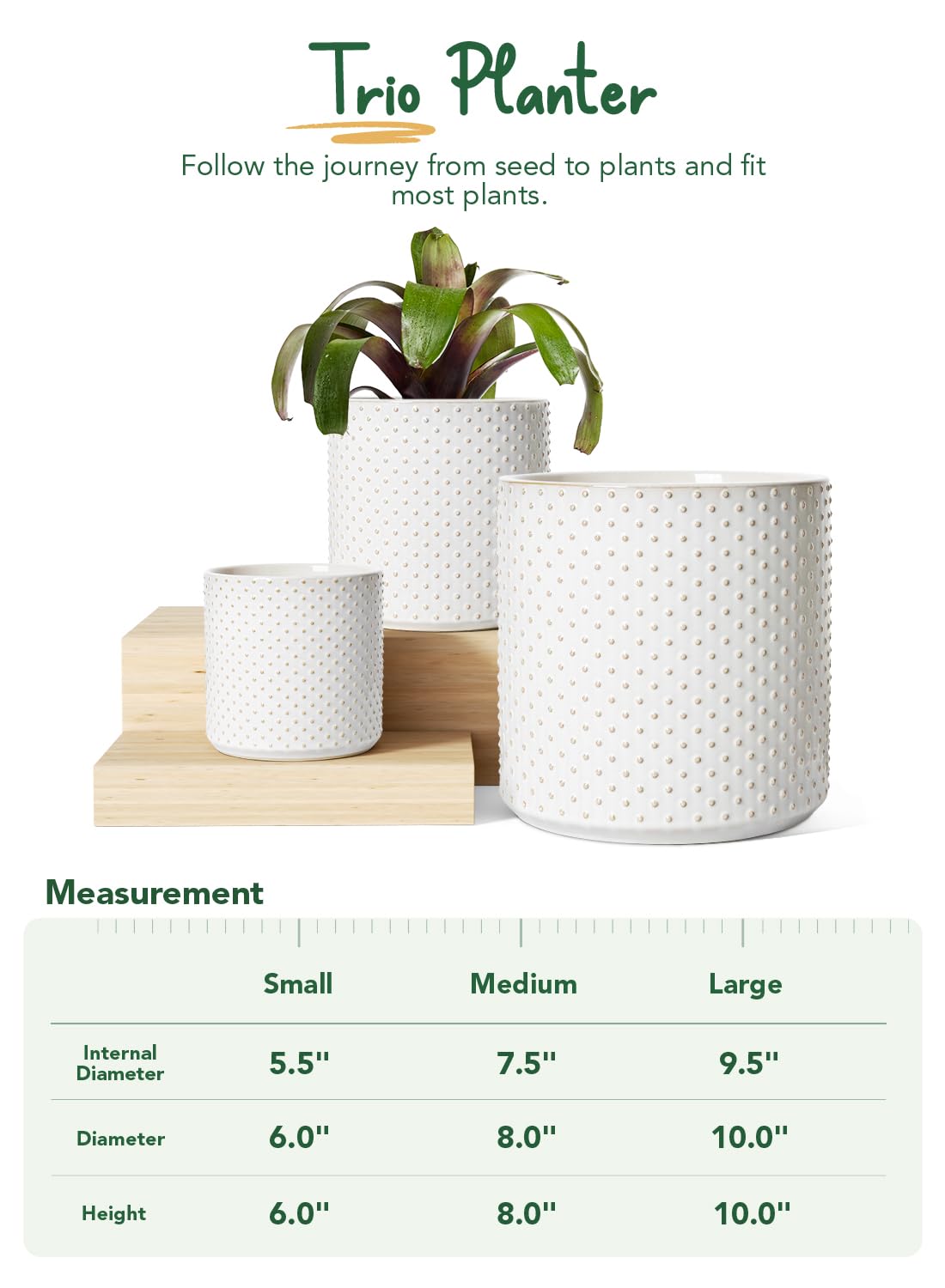 - Trio Size: 6/8/10 Inch - This ceramic pots for plants set provides versatile space for your different plants to thrive. The perfect dimensions make it an ideal home for your green companions.