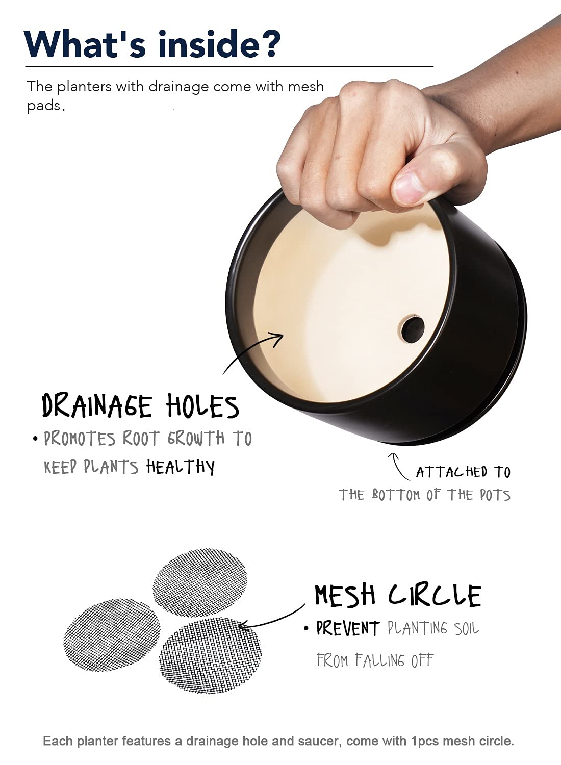 - 【Pots With Drainage Hole & Drip Pans & Drainage Net】 - The hold in the bottom allows the excess water to exit out of the soil when you’re watering the plant. The drainage plates are attached to the bottom of the pots and do not come off. Drainage Net is included, which is designed to prevent planting soil from falling off. (*Plant is NOT Included.)