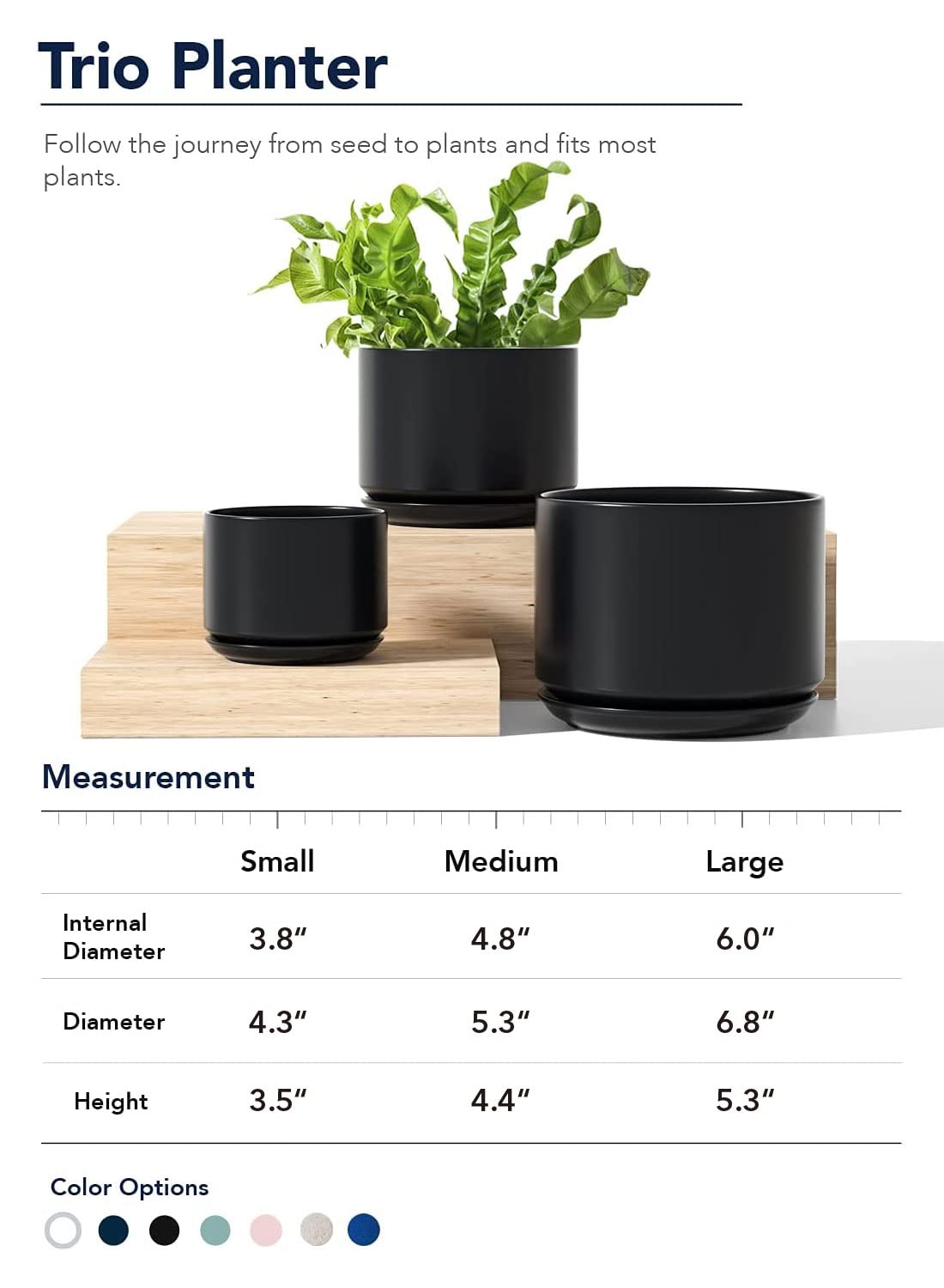 - 【Set of 3 Modern Design】 Large flower pot: 6.8 inches D X 5.3 inches H. Medium plant pot: 5.3 inches D X 4.4 inches H. Small pots for succulents: 4.3 inches D X 3.5 inches H. The sizes are different which are suitable for different sizes of smaller plants such as spider plants, nerve plants, and succulent or artificial plants.