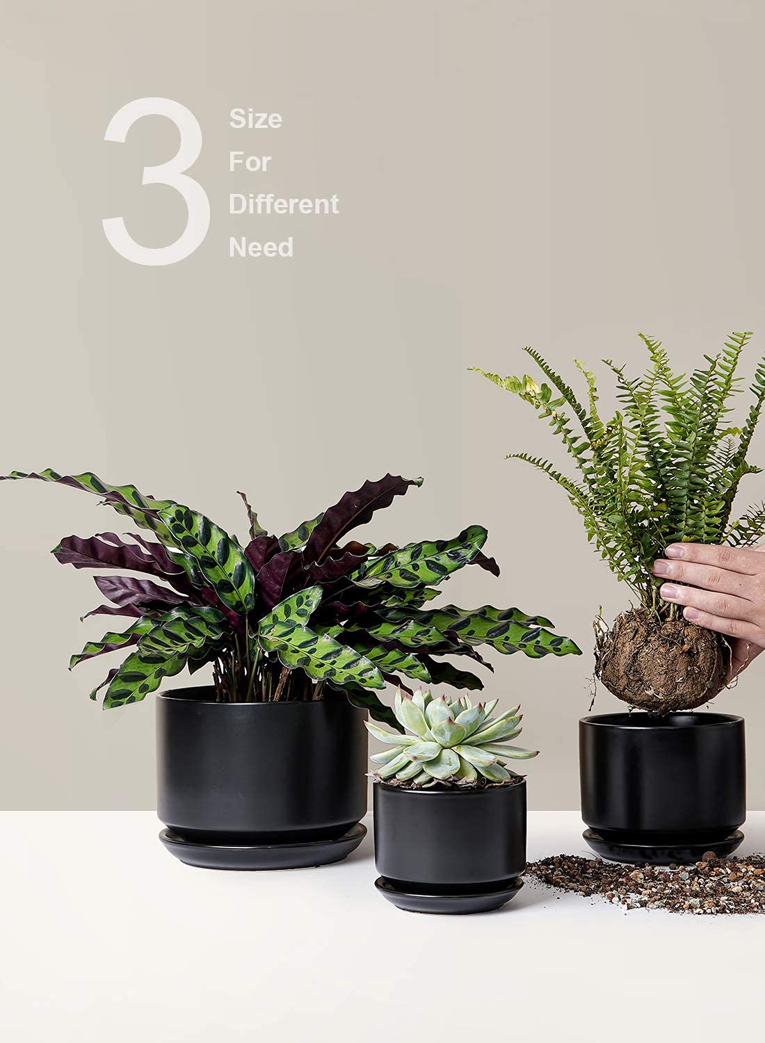 LE TAUCI Ceramic Plant Pots, 4.3+5.3+6.8 inch, Set of 3, Planters with Drainage Hole and Saucer, Indoor Flower Pot with Hole Mesh Pad, Gifts for Mom, Black