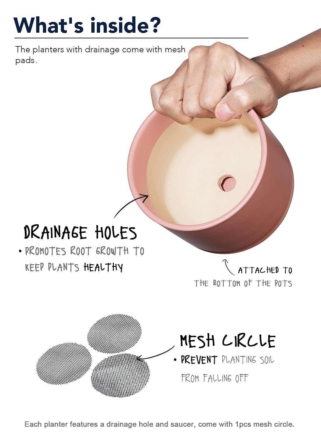 - 【Pots With Drainage Holes & Drip Pans & Drainage Net】 - The hold in the bottom allows the excess water to exit out of the soil when you’re watering the plant. The drainage plates are attached to the bottom of the pots and do not come off. Drainage Net is included, which is designed to prevent planting soil from falling off. (*Plant is NOT Included.)