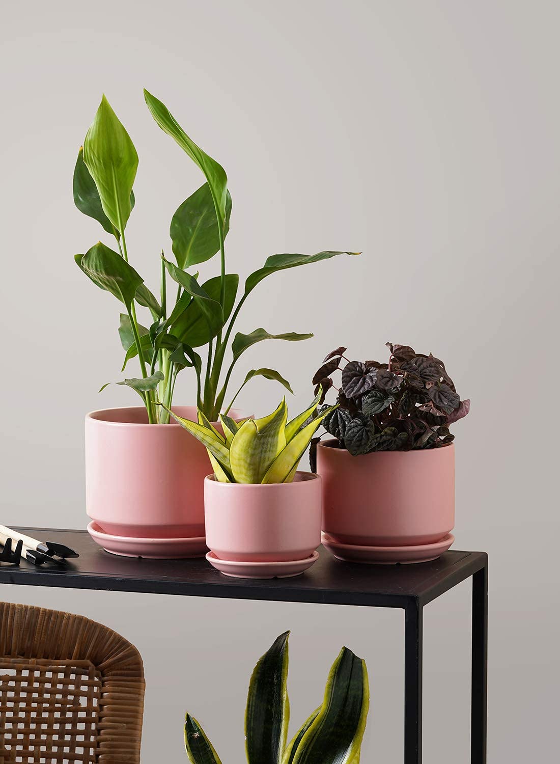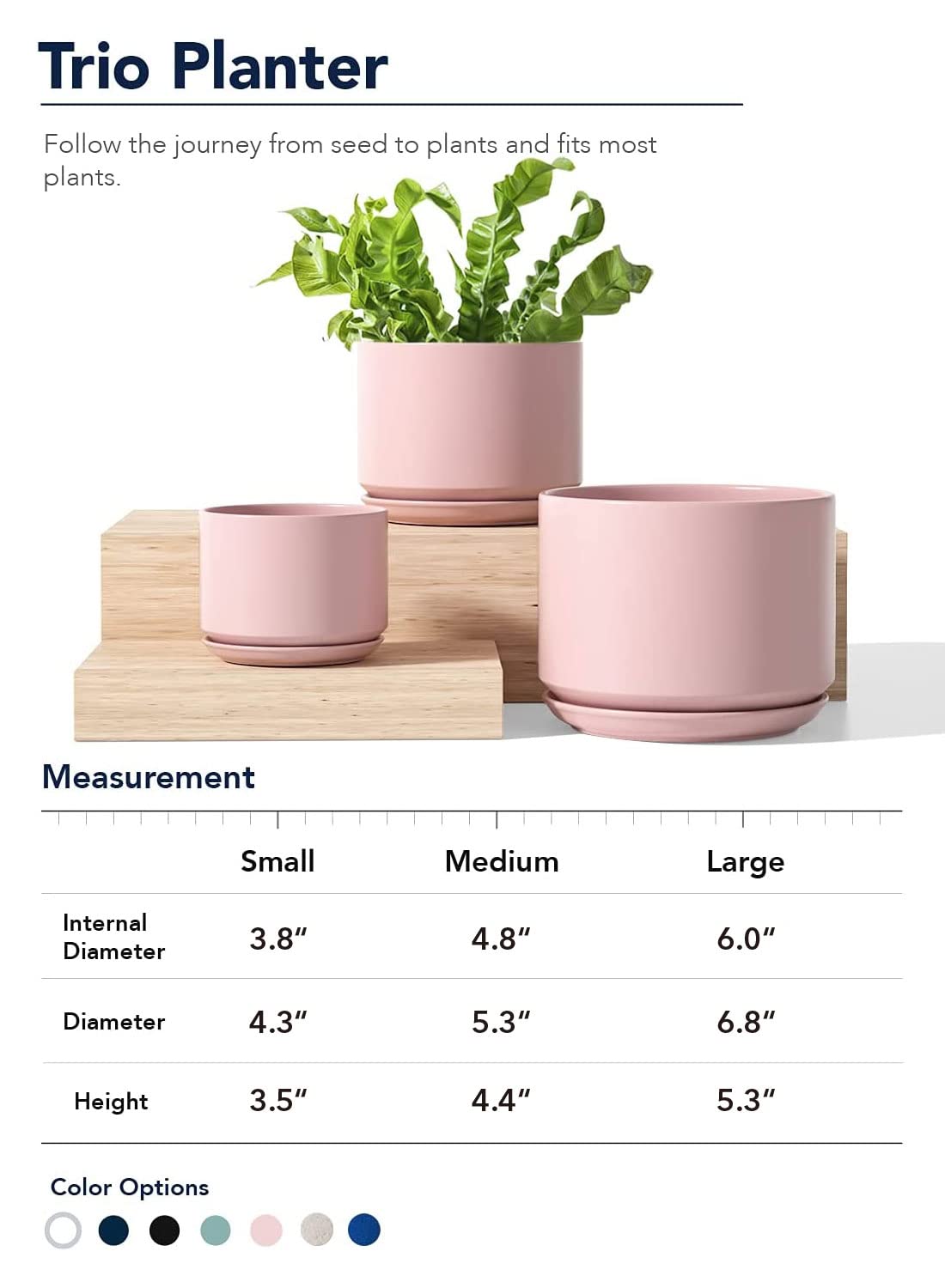 - 【Set of 3 Modern Design】 Large flower pot: 6.8 inches D X 5.3 inches H. Medium plant pot: 5.3 inches D X 4.4 inches H. Small pots for succulents: 4.3 inches D X 3.5 inches H. The sizes are different which are suitable for different sizes of smaller plants such as spider plan, nerve plant and succulent or artificial plants.