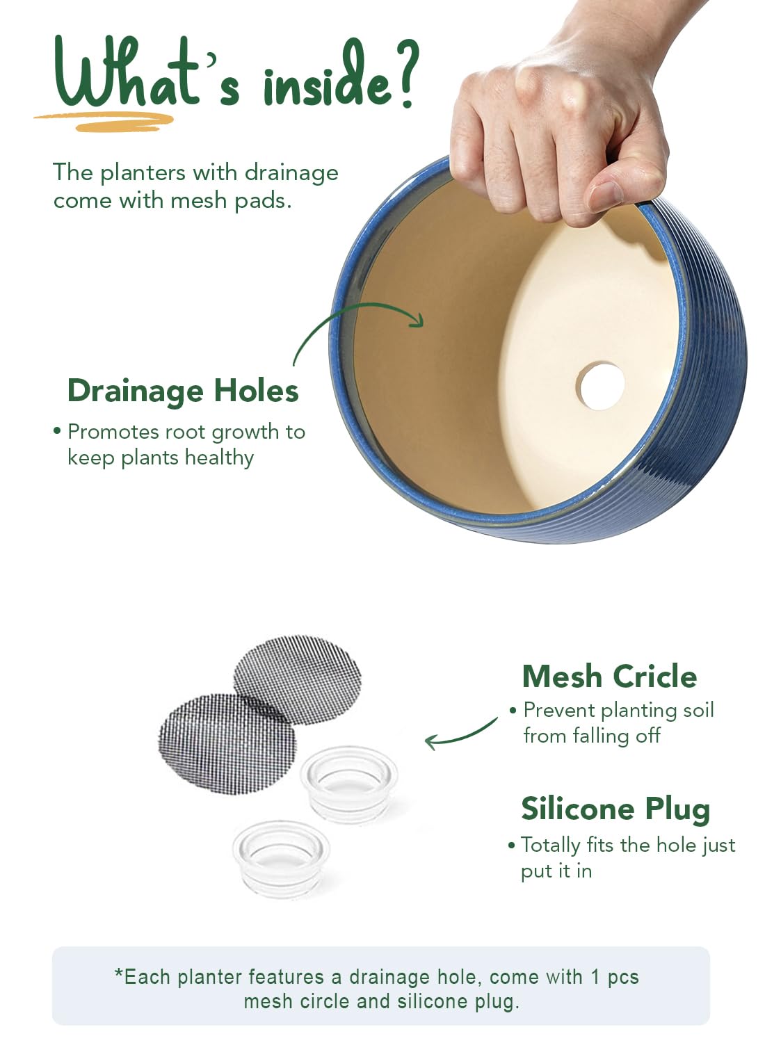 - Thoughtful Accessories- Our flower pots for indoor plants include silicon plug and drainage hole net, giving you full control. Let roots enjoy moisture while avoiding excess water. Seal with a silicon plug to prevent leaks or use a mesh pad to retain soil and provide optimal ventilation.(*Plant not included.)