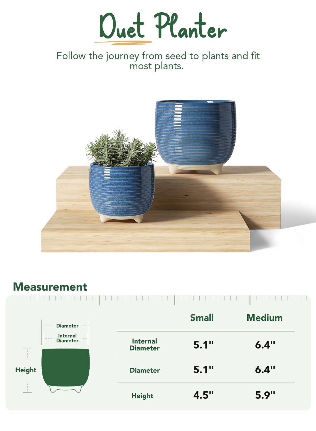 LE TAUCI Ceramic Plant Pots, 5.1 + 6.4 Inch Footed Pots for Plants, Modern Flower Pots for Home and Office, Indoor Planters with Drainage, Reactive Glaze Blue