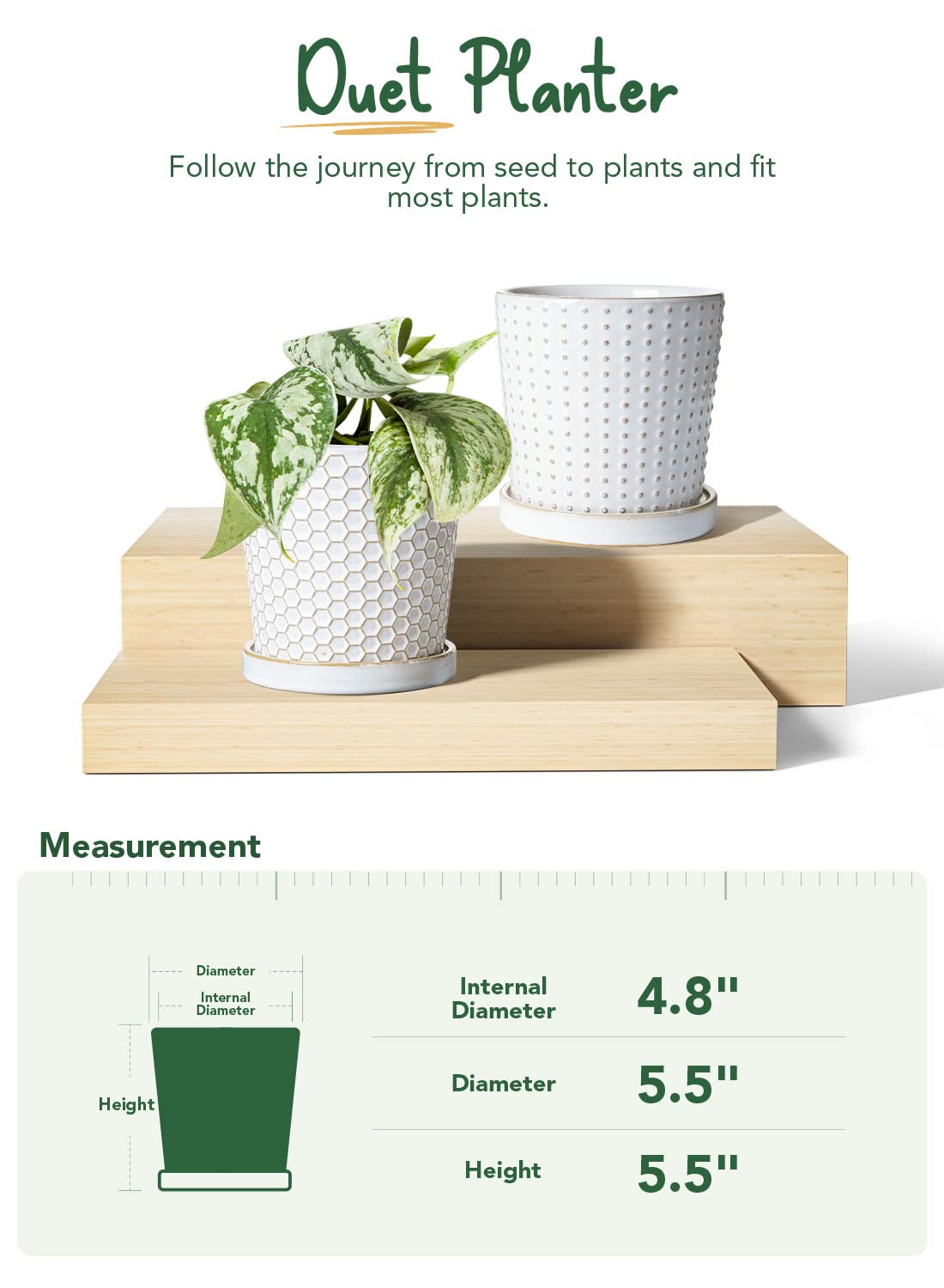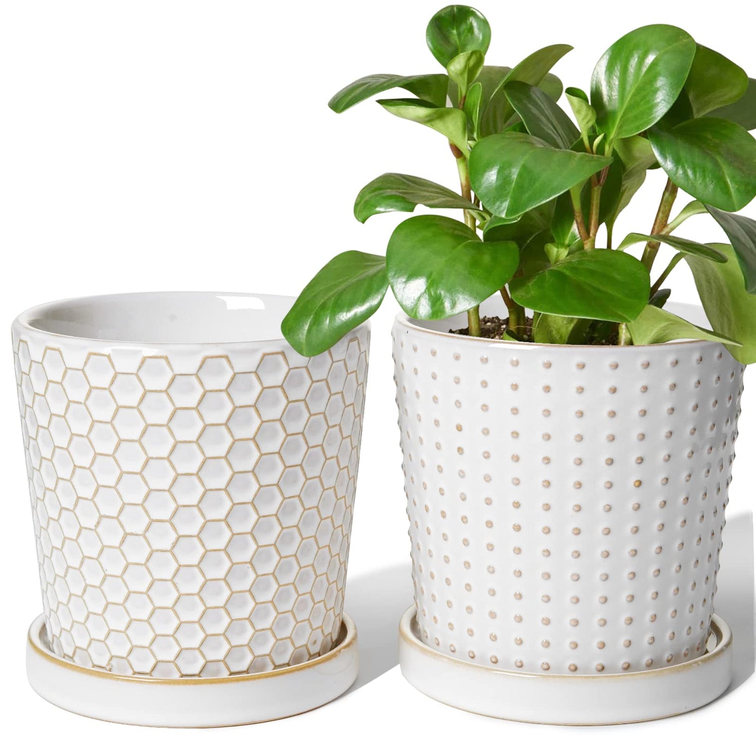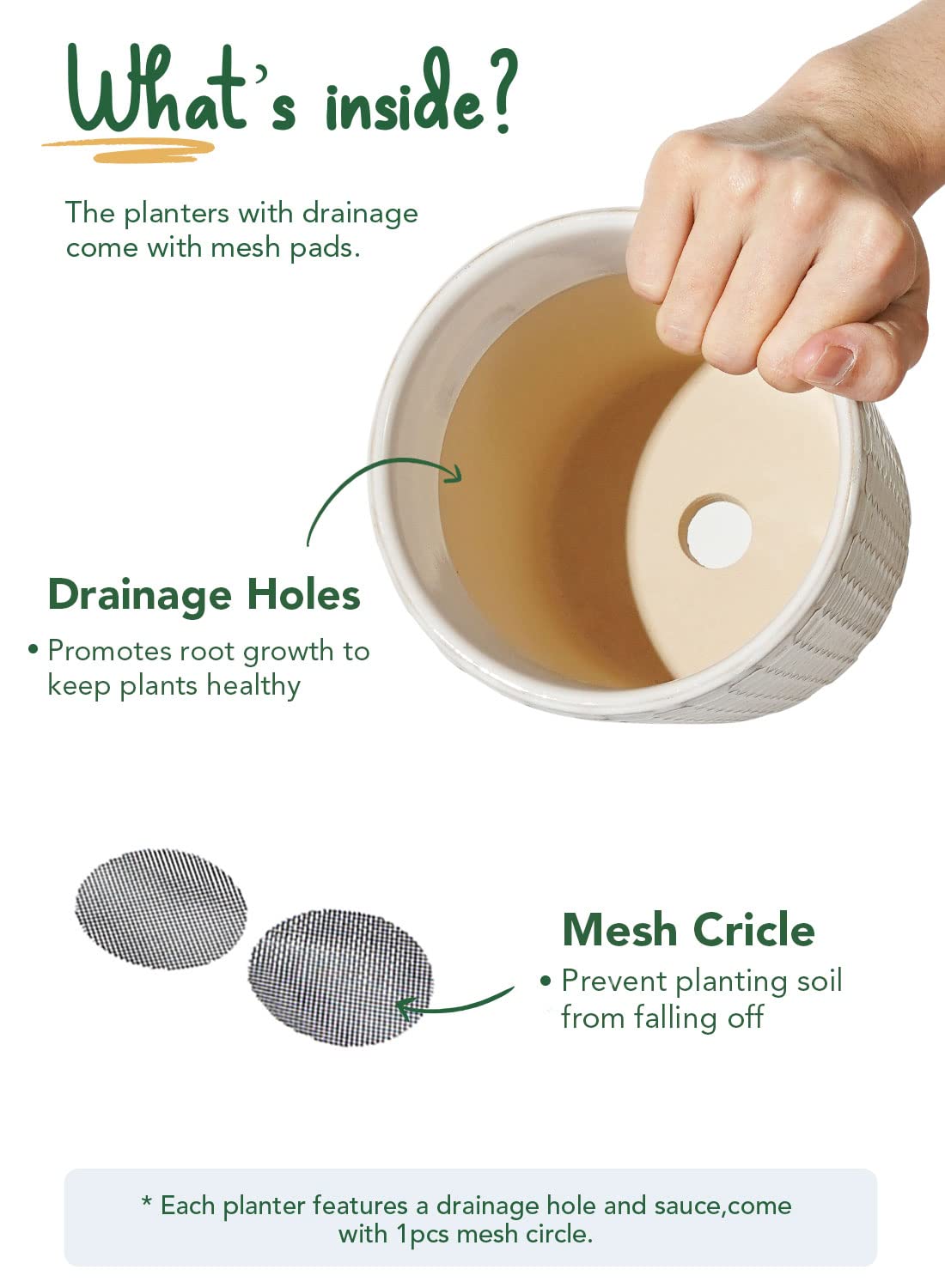 - Thoughtful Accessories - Our pots for indoor plants include drainage hole net and saucers, giving you full control. Let roots enjoy moisture while avoiding excess water. Seal with a saucers to prevent leaks or use a mesh pad to retain soil and provide optimal ventilation. (*Plant not included.)