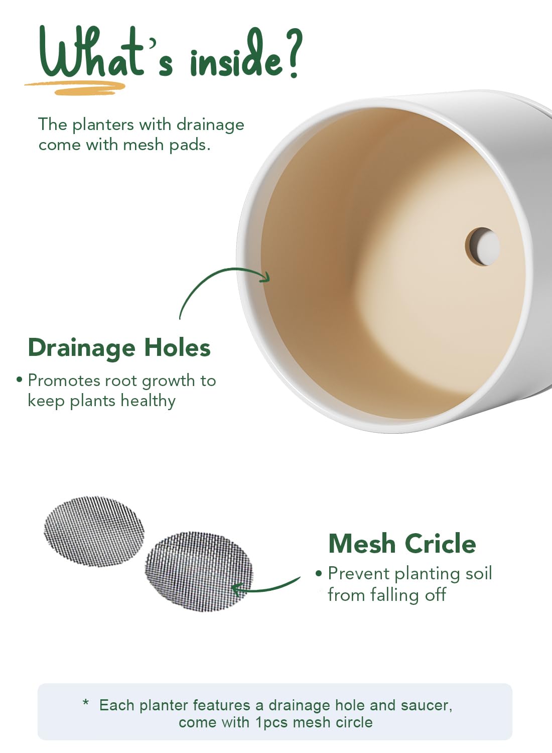 - Thoughtful Accessories- Our planters for indoor plants include drainage hole net and saucers, giving you full control. Let roots enjoy moisture while avoiding excess water. Seal with a saucers to prevent leaks or use a mesh pad to retain soil and provide optimal ventilation. (*Tray and pot cannot be separated.)
