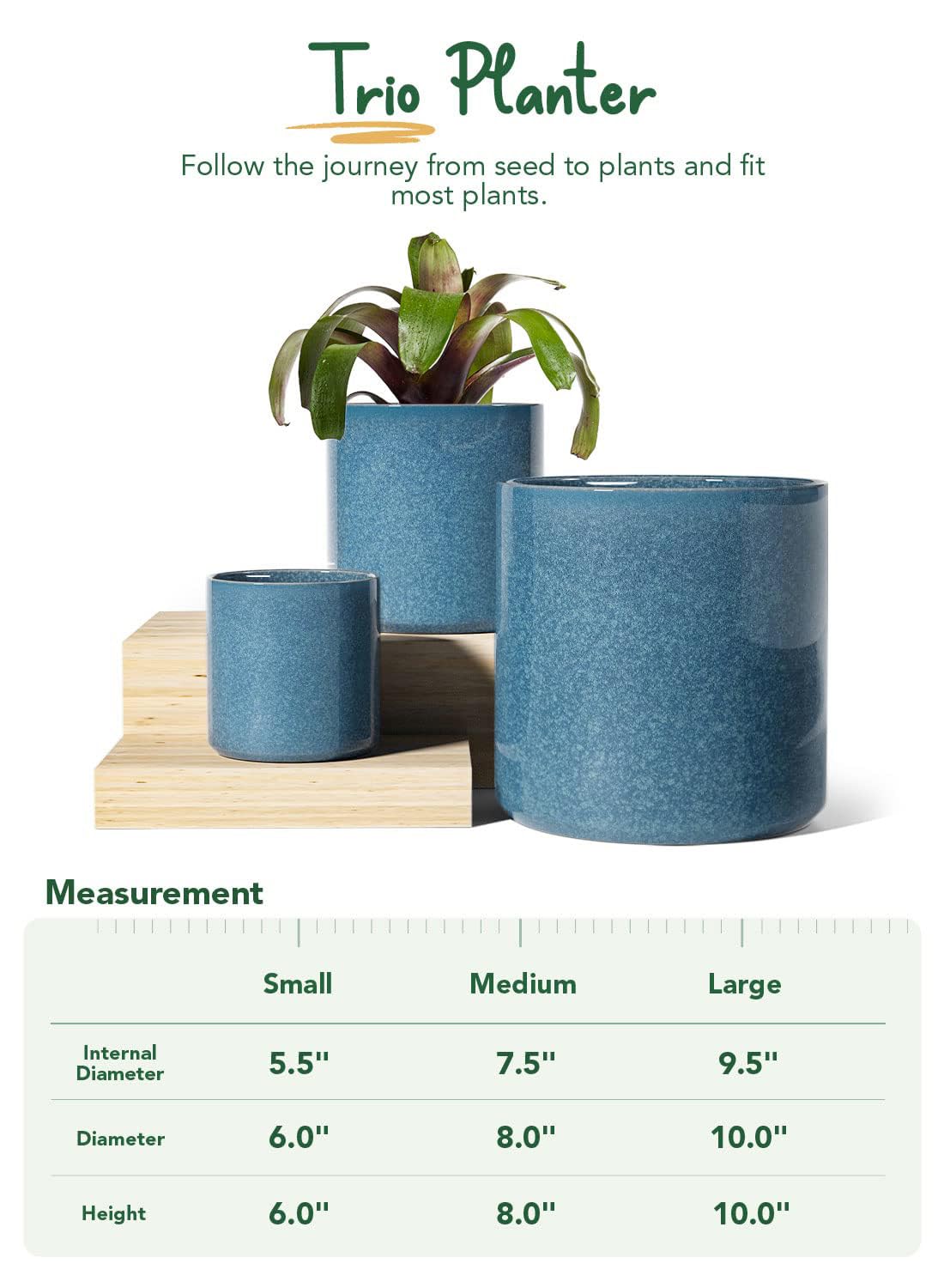 Details: THREE-PIECE PLANTERS (Diameter*height) - small size: 6"x6", medium size: 8"x8", large size: 10"x 10". Three small to large planter pots follow the journey from seed to plants and fit most kinds of indoor plants like snake plants, philodendrons, Monstera Deliciosa, Large Majesty Palm…all the classics.