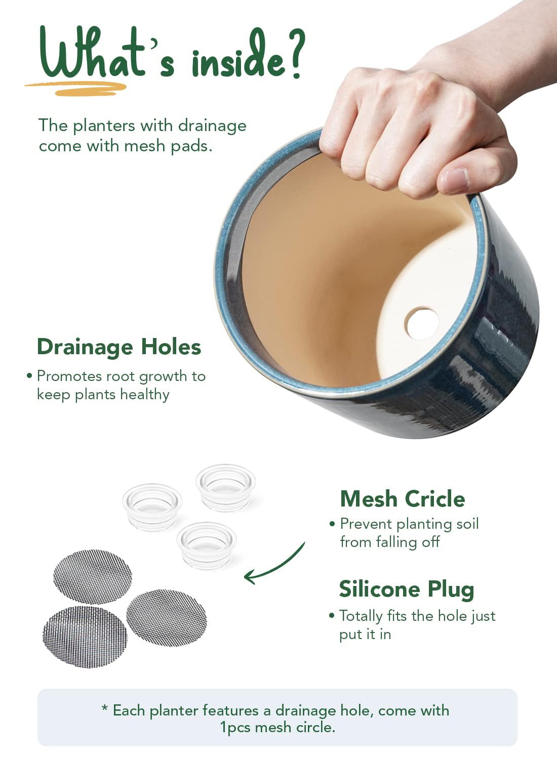 - Silicon Plug & Drainage Hole & Net Included: To drain or not to drain, it's all up to you. Roots love moisture but are afraid of excessive water. Use a silicon plug to prevent water leakage, or cover the drainage hole with a mesh pad to prevent soil loss, offering good ventilation for plants to breathe freely. (*Plant is NOT Included.)