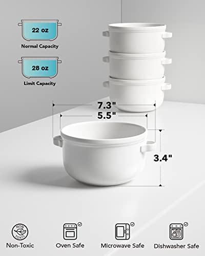 LE TAUCI French Onion Soup Bowls Oven Safe, 28 Ounce Soup Bowl with Handle, Chlli Bowl, Onion Soup Crocks for Stew, Onion, Soup, Set of 4, White