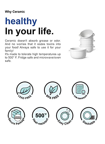 - Eat With Confidence : French onion soup bowls are made of high-quality natural clay to ensure high-quality porcelain , free of lead and mercury , resistant to cracking and chip , and can be reused . To save space , it can be easily stacked together and stored neatly in your cabinet.