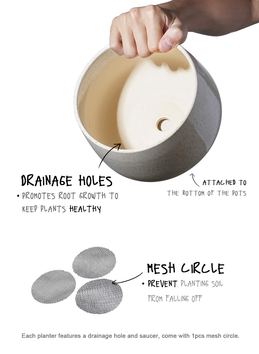 • 【Create Optimal Conditions for Plant Roots】 Half of the interior is left unglazed so that the clay could absorb proper moisture. When a plant grown in clay, the flower pot transpires water very easily between a totally saturated media and a dryer media at the root system. Better water infiltration and air movement are allowed to stimulate root growth, which results in healthier plants. If you tend to overwater, the indoor planters with unglazed clay and drainage holes would be your helper.