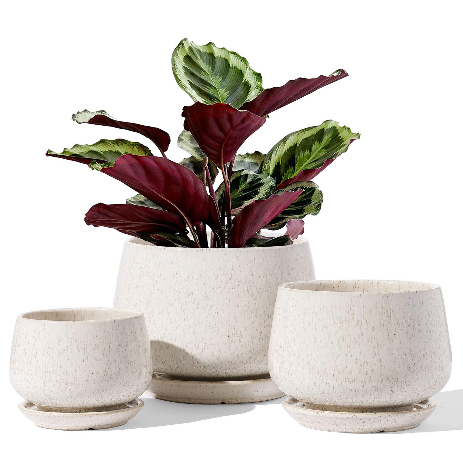LE TAUCI Plant Pots, 4.1+5.1+6.5 inch, Set of 3, Ceramic Planters with Drainage Hole and Saucer, Indoor Flower Pot with Hole Mesh Pad, Gifts for Mom, Reactive Glaze Beige