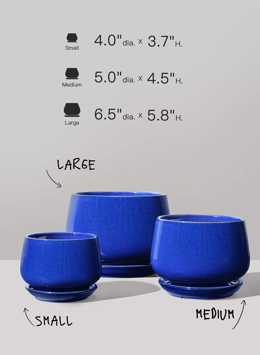 LE TAUCI Plant Pots, 4.1+5.1+6.5 inch, Set of 3, Ceramic Planters with Drainage Hole and Saucer, Indoor Flower Pot with Hole Mesh Pad, Gifts for Mom, Sapphire Blue