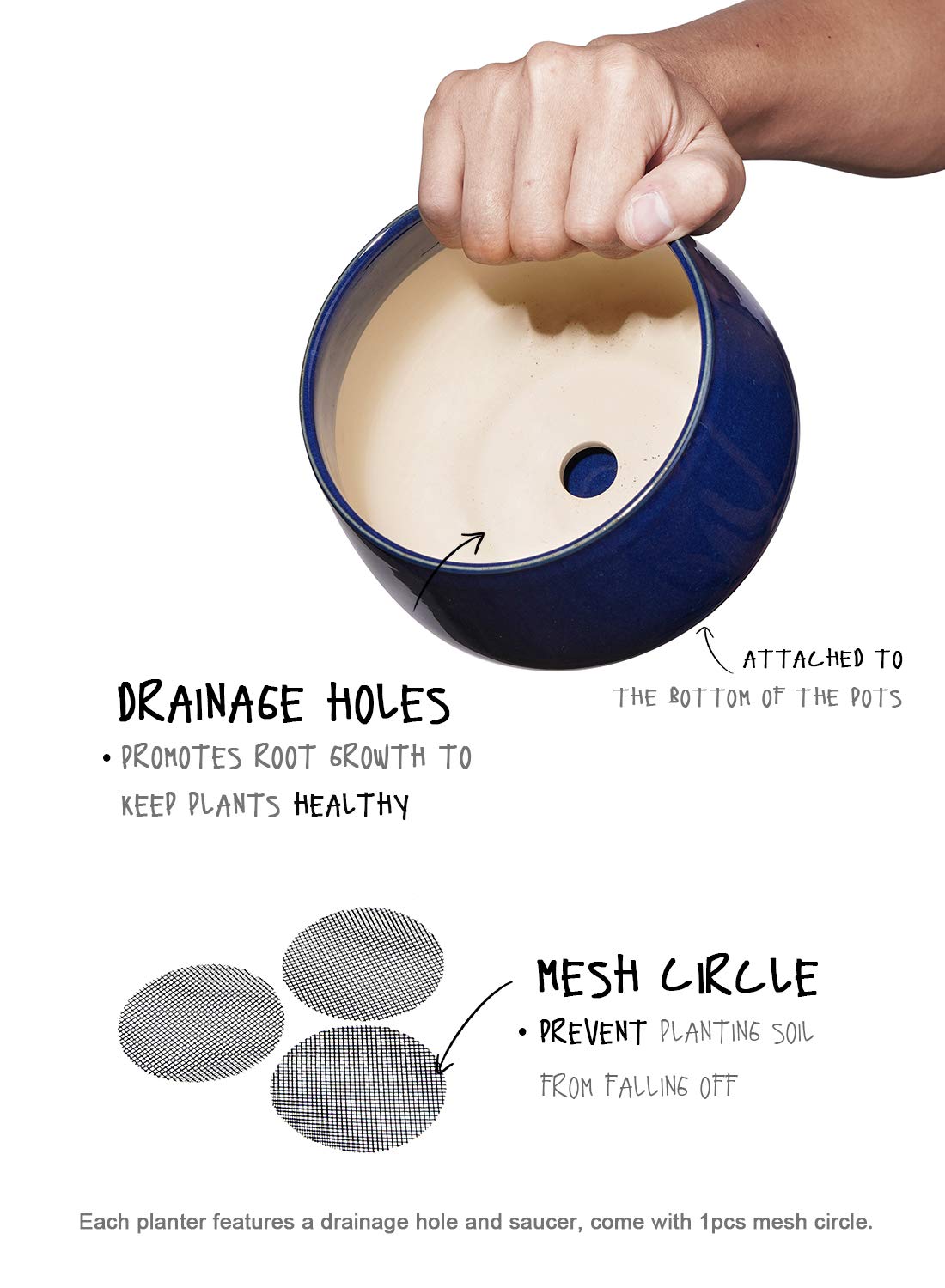 Details: Why choose these trio planter pots? ✔Provide optimal conditions for plant roots to grow ✔Drainage Holes & Drip Pans & Drainage Net included ✔Quality ceramic that doesn’t crack easily Set of 3 A set of 3 to fit your plants for an eye-catching effect that works just as well on the tabletop as it does on the patio. ✔Large flower pot: 6.5 inches in diameter and 5.8 inches in height ✔Medium plant pot: 5 inches in diameter and 4.5 inches in height ✔Small pots for succulents: 4 inches in diameter and 3.74 inches in height Withstand extreme weather The planters allow you to enjoy planting outdoor plants in all types of weather. Built to withstand intense sun and harsh winter temperatures, free from fade, frost, crack and peel damage so you can use it indoors and outdoors freely.