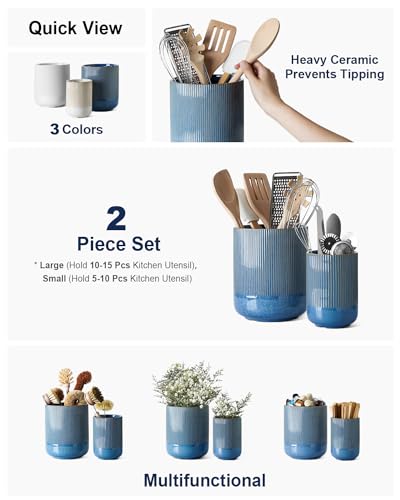 LE TAUCI Utensil Holder, 7.3"+5.4" Ceramic Kitchen Utensil Holder for Countertop, Large Cooking Utensil Crocks Gift for Mother's Day, Costal Ocean Home Kitchen Decor, Set of 2,Glaze Marble Blue